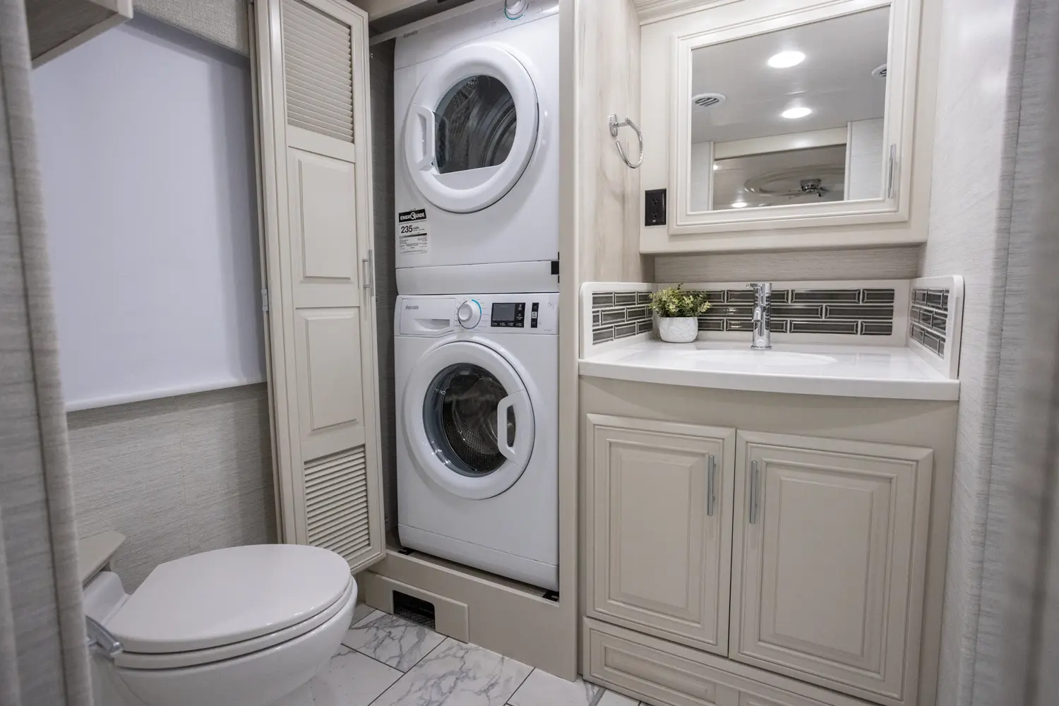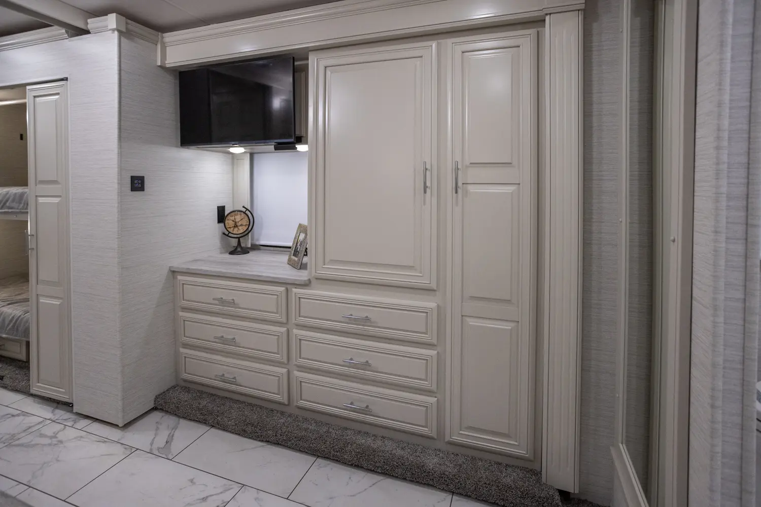 The Berkshire XL 40E is a three-slide bunkhouse model with two full bathrooms. The rear full bath includes a shower, vanity sink with medicine cabinet, and stacking washer/dryer. The bedroom has a slideout, 72" x 80" Tilt-a-View king bed, plus a dresser, wardrobe cabinet, TV, and overhead cupboard. The second full bath sits across from the bunk room/wardrobe combo. The kitchen is fully equipped, with a convection microwave, induction cooktop, and residential-style refrigerator.