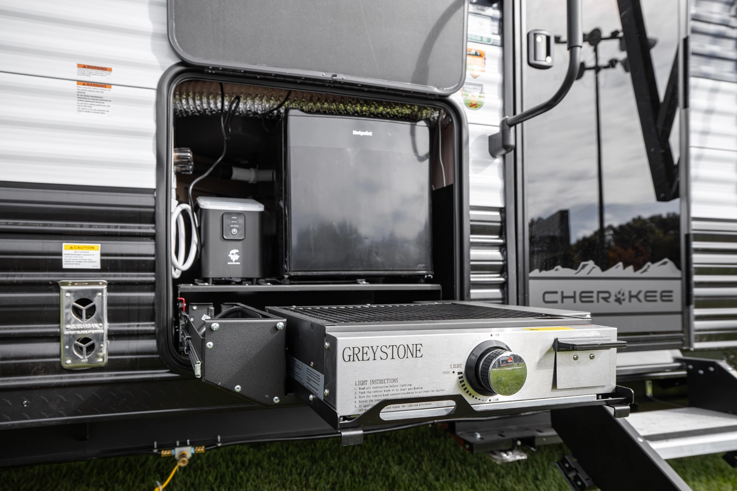 • Cherokee Black Label Grey Wolf (Deep Tinted Frameless Automotive Glass Windows, High Gloss Gel Coat Exterior Sidewalls, Multicolor Reading Lights, Pillowtop Mattress Upgrade, Power Tongue Jack, Pull Out Sprayer Faucet, Solid Surface Countertops, Thermo Foil Arctic Insulation)