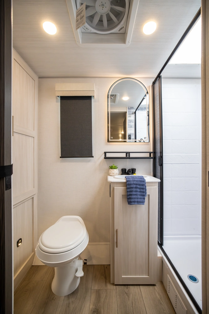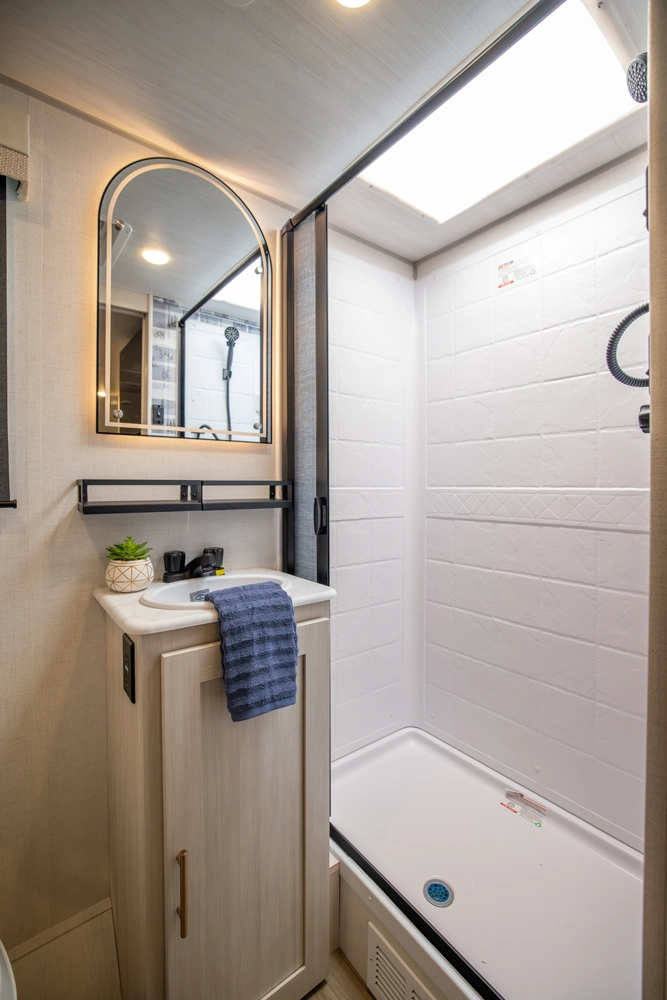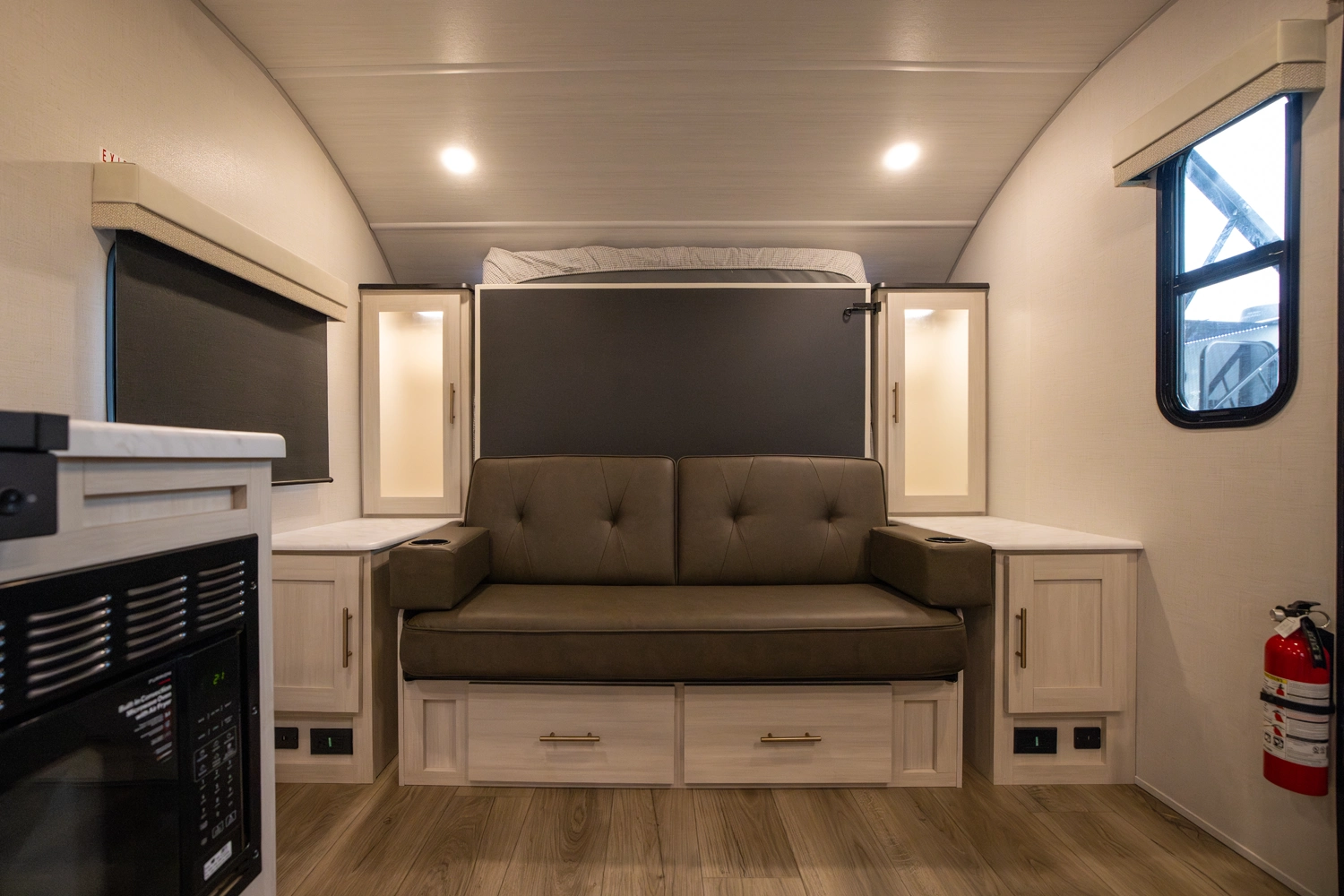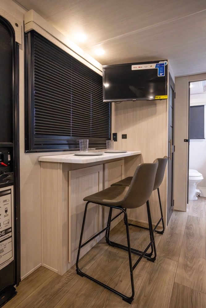 The RP-197 combines lightweight towing with a versatile layout. A front Murphy bed converts to a sofa for extra living space, while the rear full bath adds convenience. The kitchen and living area feature a bar top with a flip-up window, ideal for serving or relaxing outdoors. Modern finishes and smart storage make this trailer perfect for couples or small families seeking comfort on the road.