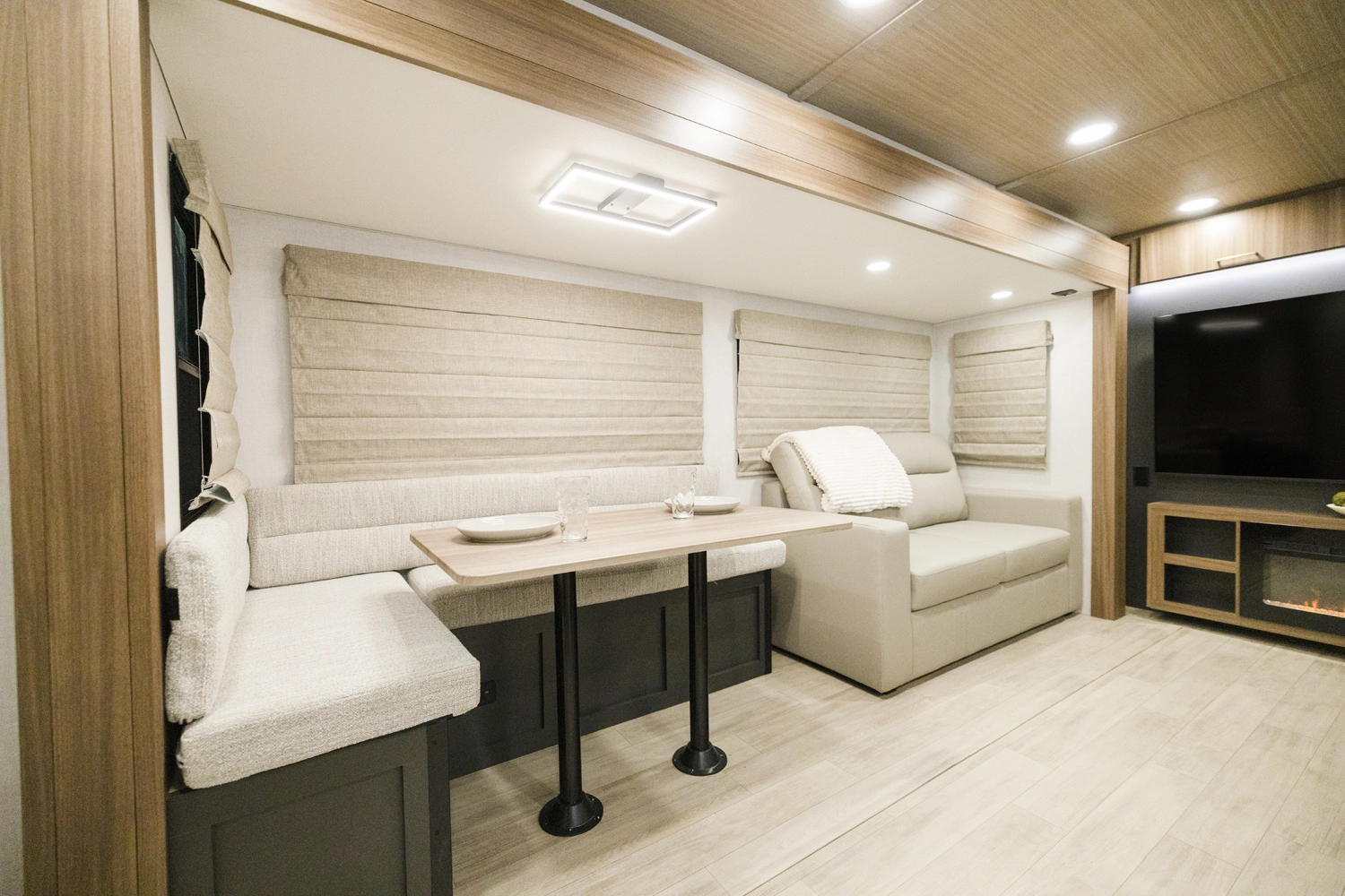The 2600RK is a popular floorplan as we deliver a spacious rear kitchen with an ample amount of natural light and windows. This floorplan has a lot of energy focused on quality time with the family as the 2600RK comes complete with a 5-person dinette, tri-fold sofa (turns into bed), and two separate recliner chairs all within view of the kitchen. With a king bed and washer/dryer prep this lightweight coach offers more functional space than ever.